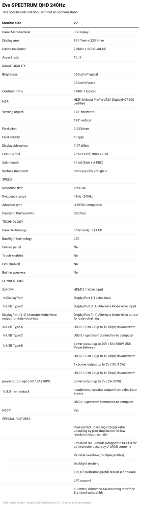Reputable display manufacturers like Asus, Acer and LG, the manufacturer of SPECTRUM’s panel, have monitors of the same caliber for almost $150 more than EVE’s monitor on places like Amazon and Newegg.
